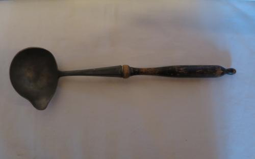 Liten soppslev av tenn med skaft av svärtat trä (nu med härligt slitage).